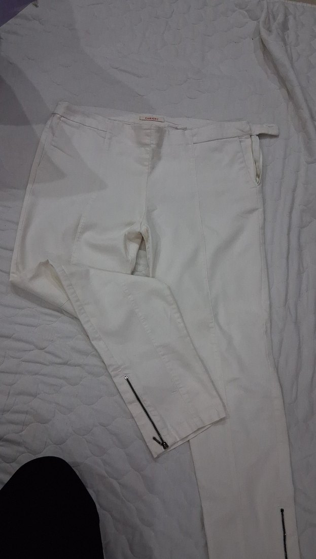 Kadınlar için beyaz kumaş pantolon, regular fit kesim ve fermuarlı cepler ile bilek detaylarına sahip. Midi boy ve düz tasarımı, günlük sokak stiline uygun. Rahat sentetik kumaştan üretilmiştir.
