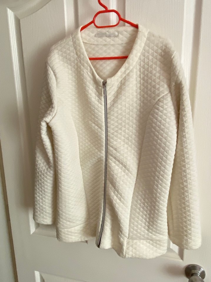 Fermuarlı, uzun kollu, yuvarlak yakalı pamuklu kadın ceket. Düz ve minimalist tarzda, günlük kullanım için uygun, normal boyda beyaz renkte.