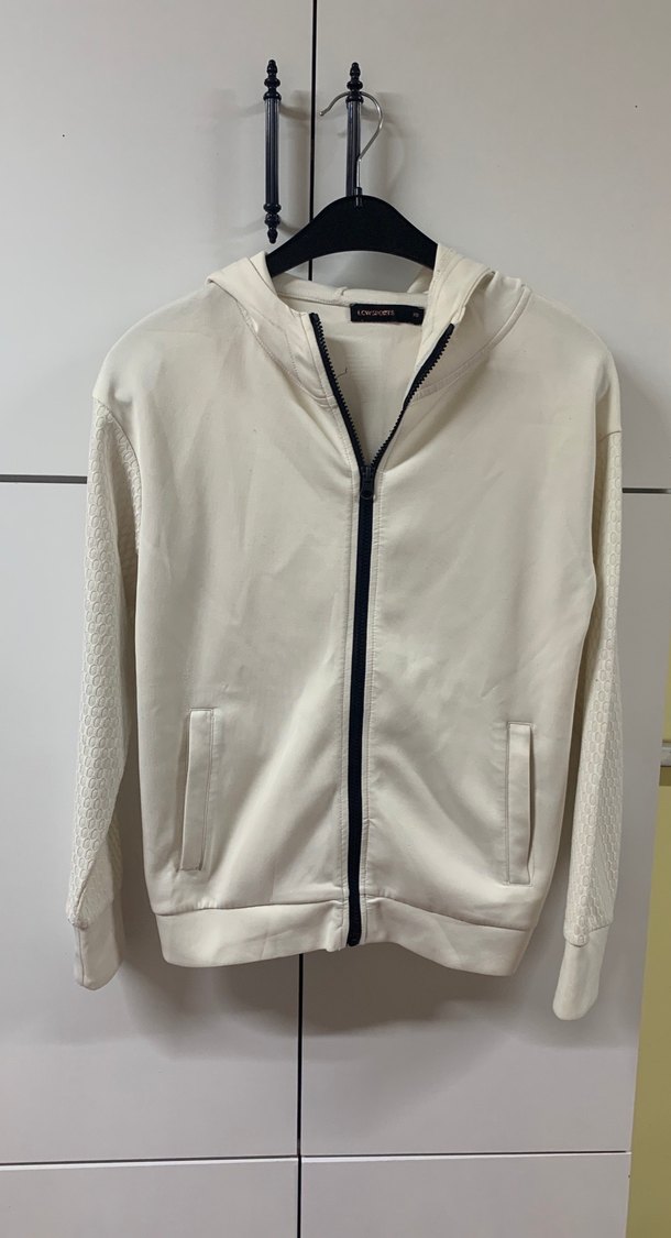 Kadın beyaz fermuarlı ceket, yüksek yakalı ve uzun kolludur. Orta boy, vücuda oturan kesime sahip, yumuşak sentetik kumaştan üretilmiştir.