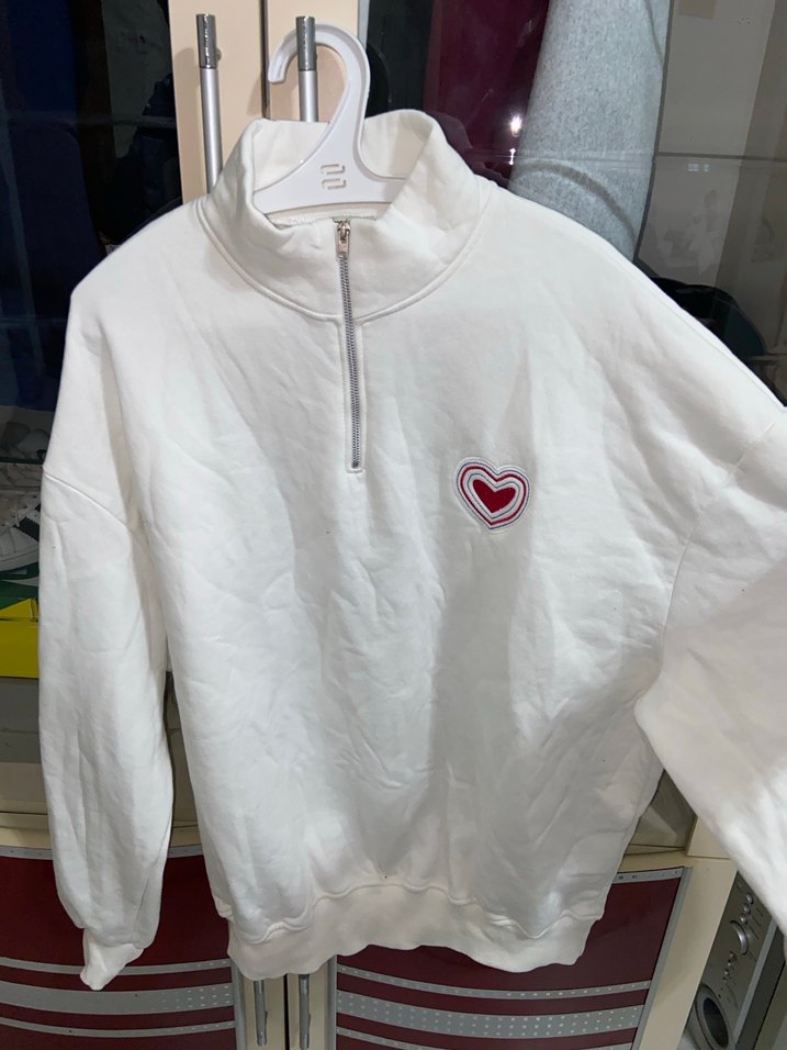 Kadınlar için uzun kollu, fermuarlı ve bisiklet yaka beyaz sweatshirt. Rahat kesim, yumuşak ve sıcak kumaştan, küçük baskılı kalp detayıyla günlük sokak stili için uygundur.