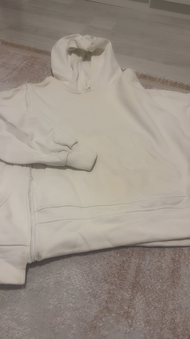 Kadınlar için beyaz renkte, bol kesim ve yuvarlak yakalı fermuarlı sweatshirt. Orta uzunlukta, yumuşak ve sıcak kumaştan üretilmiştir. Günlük kullanıma uygundur.