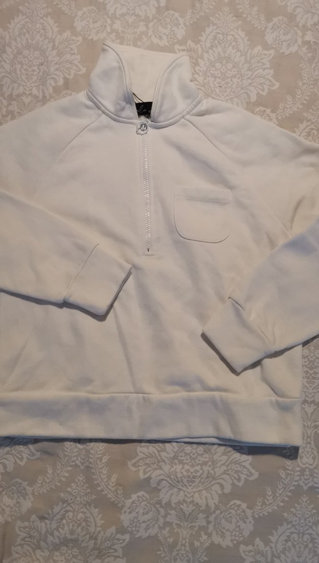 Kadınlar için beyaz, uzun kollu, fermuarlı ve yuvarlak yakalı sweatshirt. Yumuşak ve sıcak kumaştan, rahat ve normal midi boyda. Günlük kullanım için uygundur.