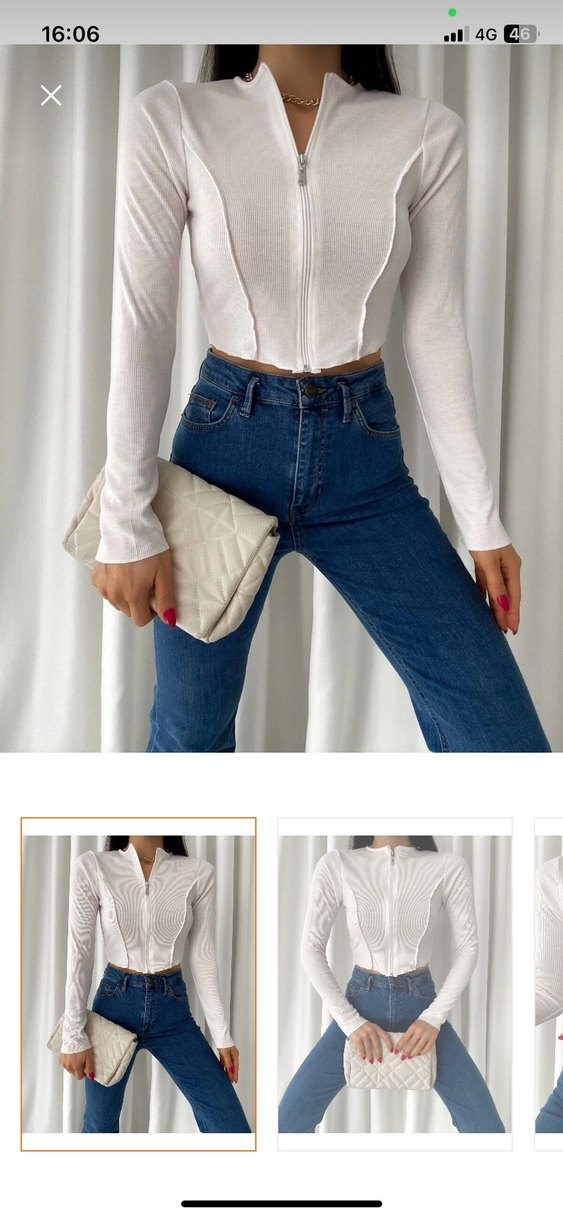 Beyaz renkli, uzun kollu, fermuarlı ve vücuda oturan kesime sahip kadın crop bluz.