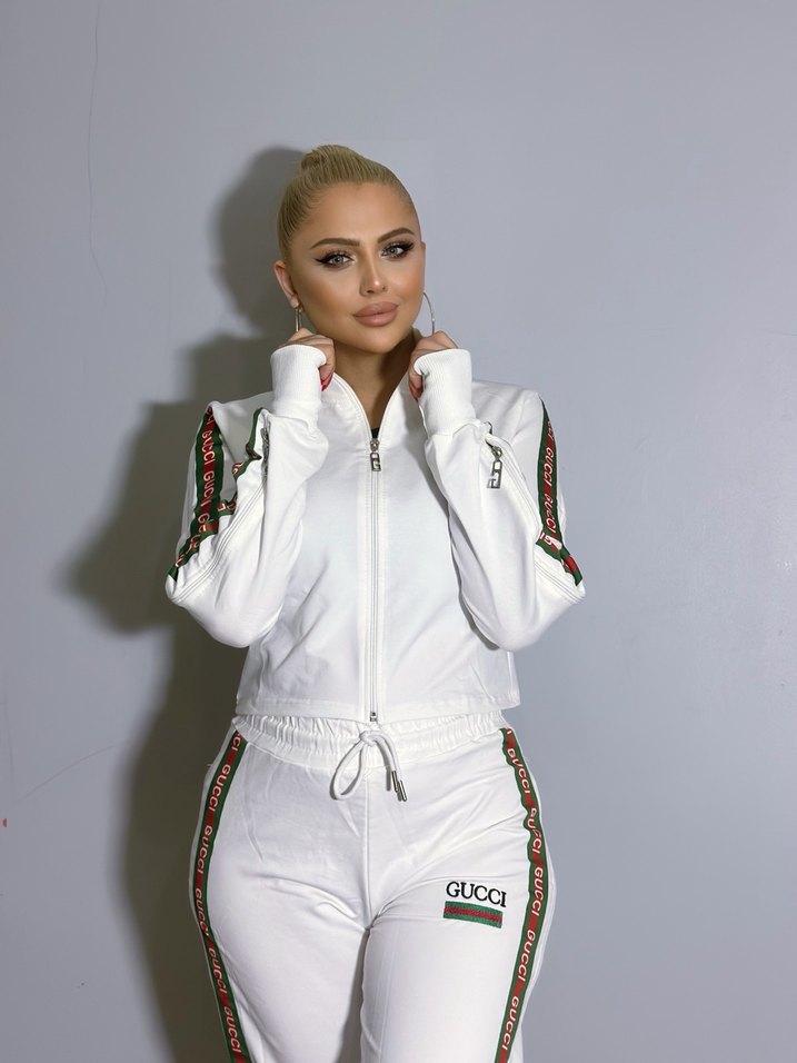 Fermuarlı önü, yüksek yakası ve uzun kollu beyaz, dar kesim kadın eşofman. Nakış detaylar ve logolu ile şık athleisure tarzı.