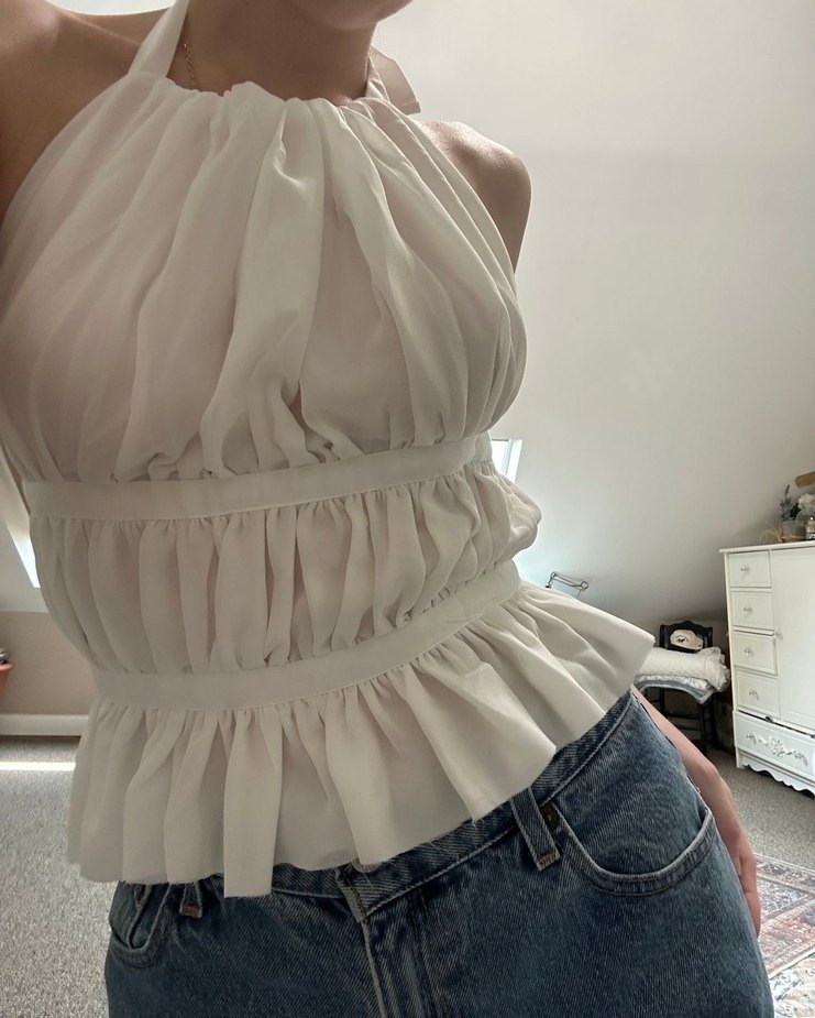 Beyaz, straplez, fırfırlı detaylara sahip, beli oturan, askılı kollu ve midi boyda kadın bluz. 1 kere giydim