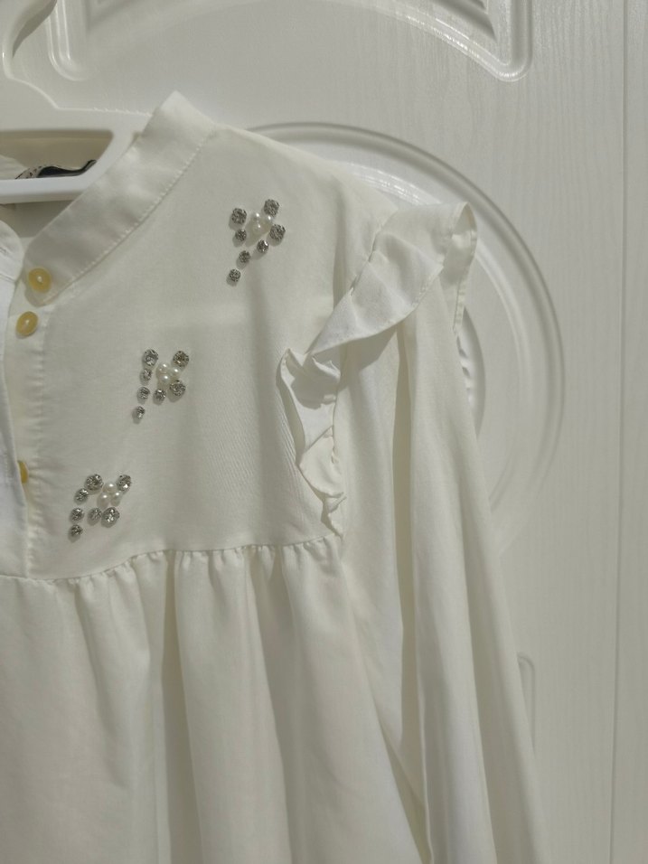 pamuklu, beyaz, bol kesim bluz. Fırfır detaylı, nakışlı ve uzun kolludur. Bohem tarzda, yuvarlak yaka.