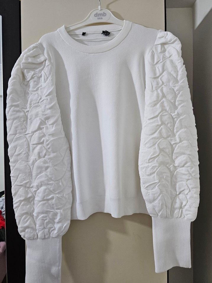 Beyaz, fırfırlı kolları ve yuvarlak yakasıyla rahat kesim triko. Yumuşak kumaştan, günlük sokak stili için uygun.