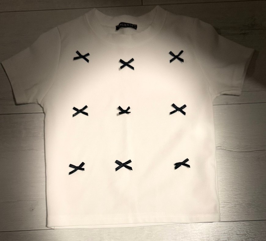 Beyaz renkli, kısa kollu ve bisiklet yaka ,Siyah nakışlı fiyonk detaylarıyla sade bir sokak stili sunar, sentetik kumaştan üretilmiştir.
