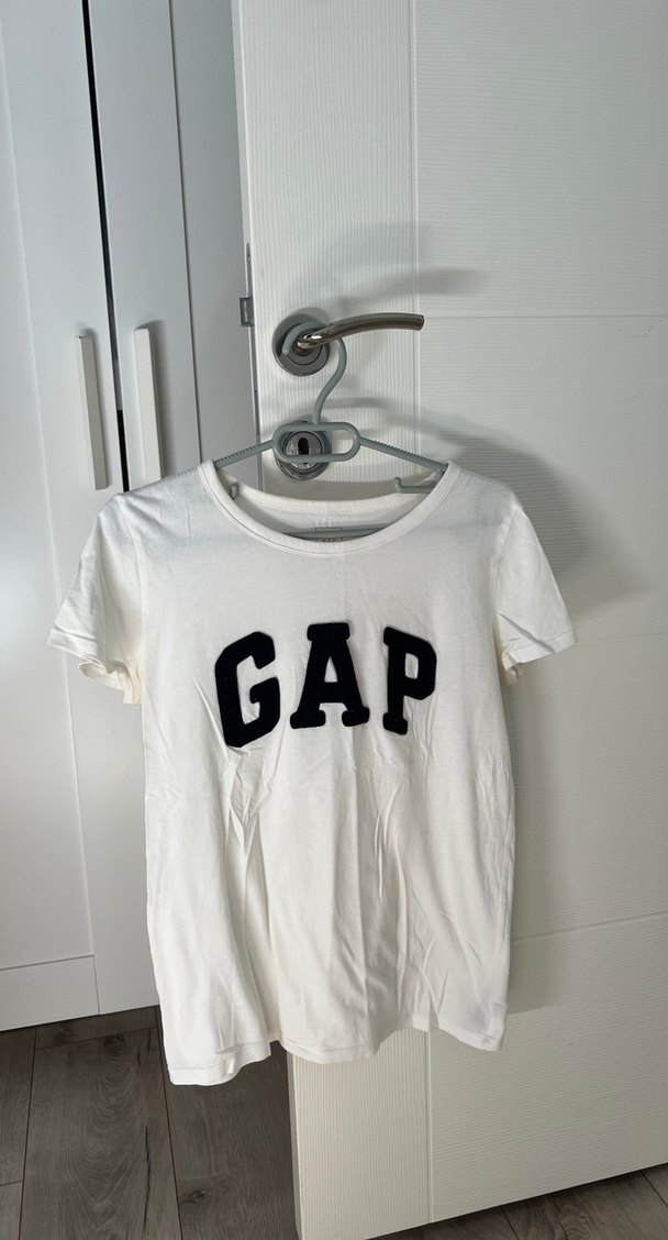 Pamuklu, kısa kollu, beyaz renkli, GAP baskılı, fitted kesim Kadın tişörtü. Orijinal yurtdışından bir gap mağazasından aldım