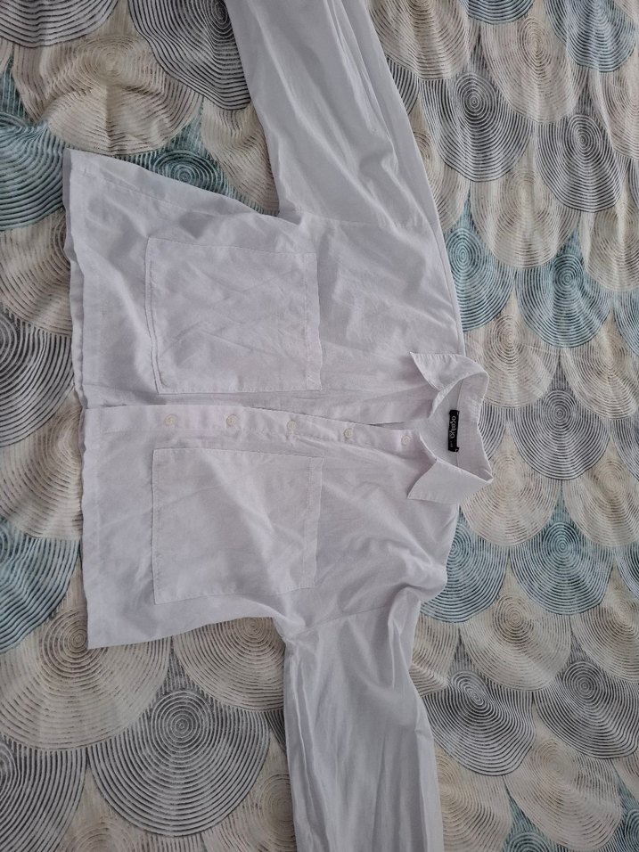 Kadınlar için beyaz keten gömlek, bol kesim, uzun kollu ve yakalıdır. Düğmeli ön kısmı ve günlük kullanıma uygun rahat sokak stili vardır.
