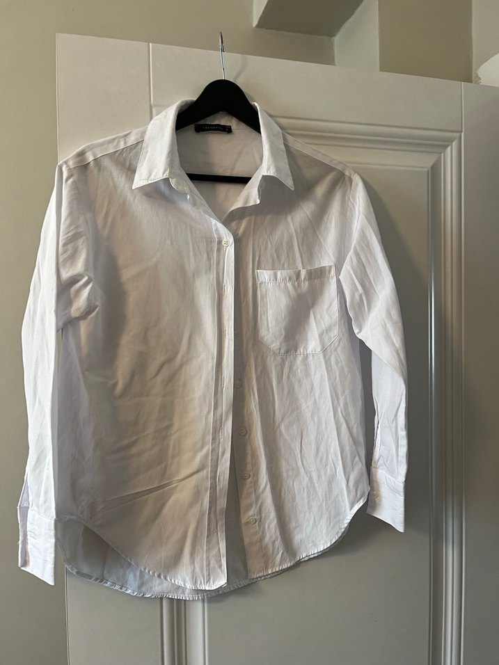Kadın beyaz gömlek, uzun kollu, yakalı ve düğmeli ön cep detayına sahip. Salaş kesim ve minimalist sokak stiliyle günlük kullanıma uygun.