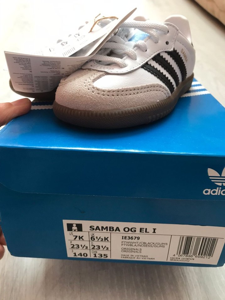 Beyaz ve gri Adidas Samba OG EL I spor ayakkabılar, dolgu topuk, cırt cırtlı kapanış ve baskılı sokak stili tasarımıyla dikkat çeker. Kauçuk tabanlıdır.