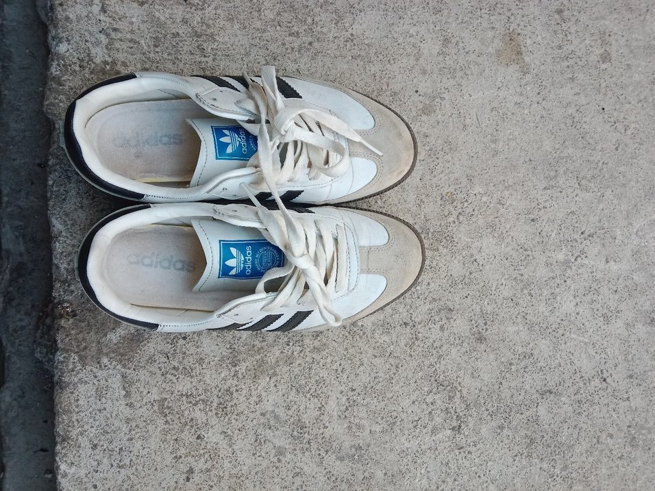 Adidas kadın spor ayakkabısı, düz tabanlı, beyaz ve gri renkli, siyah şeritli, kauçuk malzemeden, cırt cırtlı, spor ve günlük kullanıma uygun.