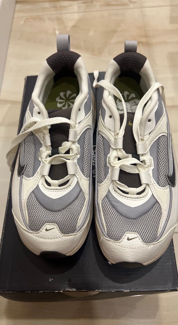 Beyaz ve gri renklerde, bağcıklı, düz tabanlı, nefes alabilir yapıda kadın spor ayakkabısı.
