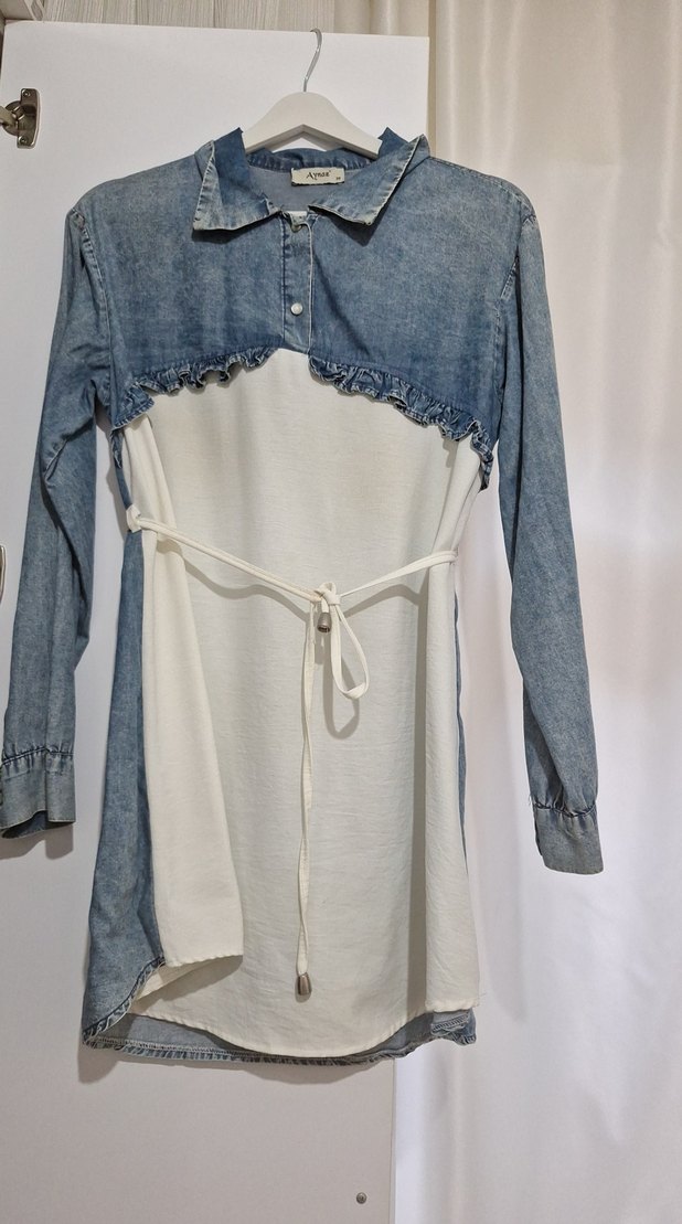 Bu tunik, bol kesim, yakalı ve uzun kolludur. Denim ve beyaz batik kumaş kuşakla tamamlanmıştır. Günlük sokak stili için uygundur.