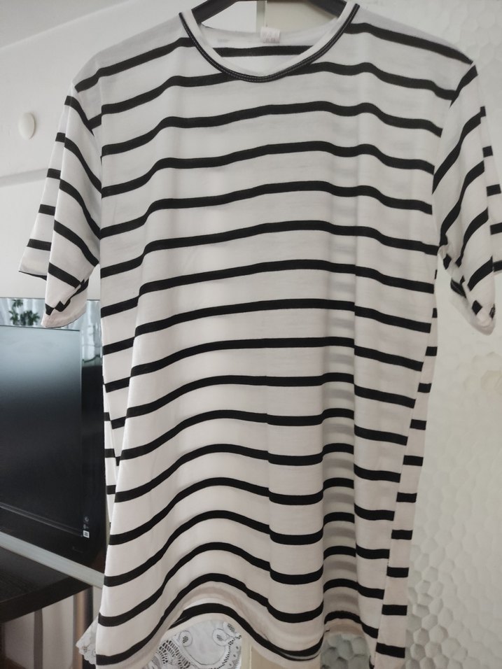 Kadınlar için kısa kollu, yuvarlak yakalı ve gevşek kesimli beyaz gri çizgili tişört. Günlük kullanıma uygun rahat ve şık bir sokak stili.