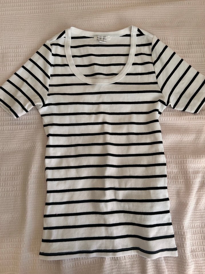 Beyaz ve gri çizgili, kısa kollu ve tekne yaka kadın tişörtü. Pamuklu kumaştan, günlük sokak modasına uygun, rahat kesim.