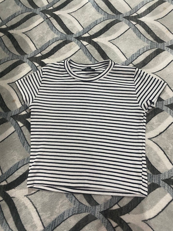 Kadınlar için kısa kollu, beyaz ve gri çizgili, pamuklu kumaştan yapılmış, tekne yaka ve normal boyda tişört. Günlük kullanım için uygundur.