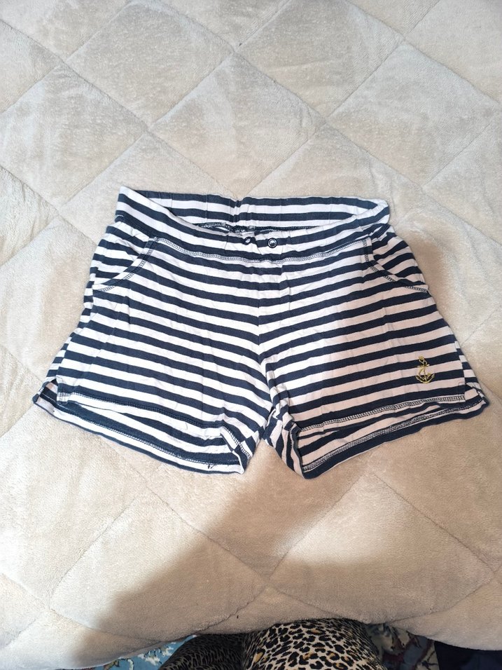 Beyaz ve gri çizgili, pamuklu kumaştan, pileli detaylı, bol kesim mini şort. Plaj ve günlük sokak giyimi için uygundur.