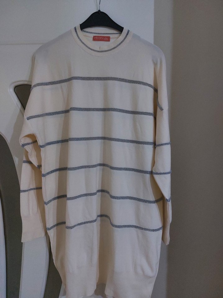 Kadınlar için uzun kollu, yuvarlak yaka, pamuklu ve bol kesim beyaz kazak. Gri yatay çizgilerle örülmüş, günlük rahat sokak stili için uygundur.