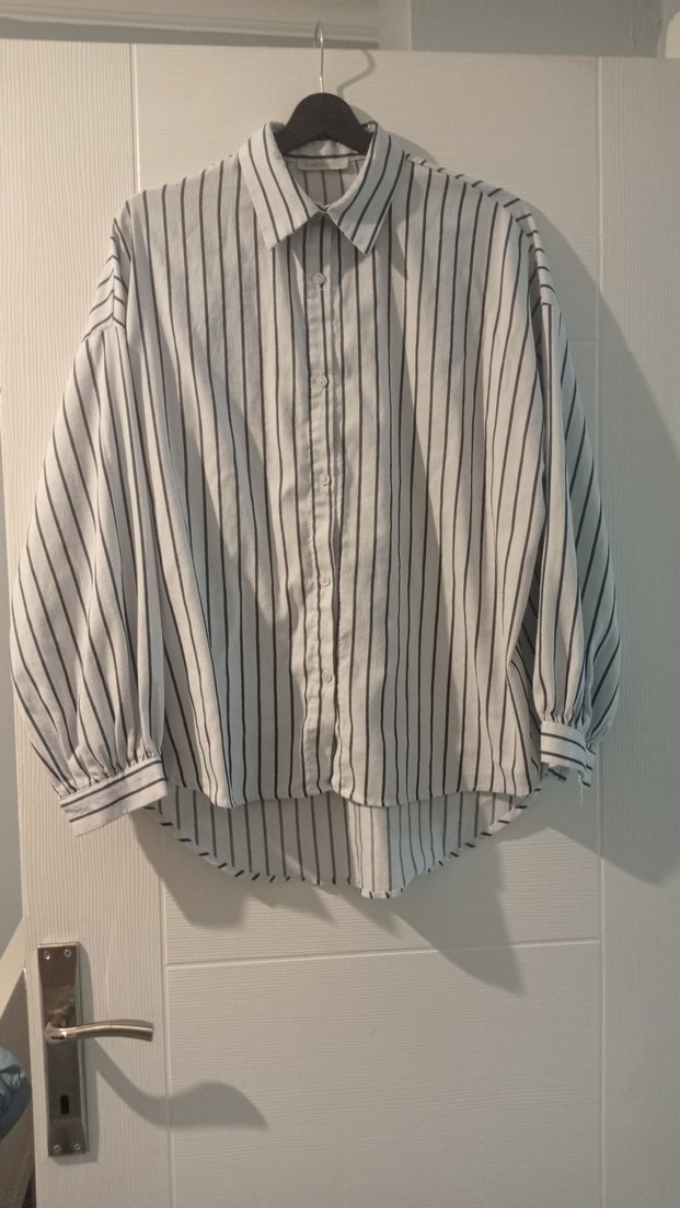 Gri çizgili beyaz keten kumaştan, düğmeli, uzun kollu, yakalı, bol kesim kadın gömleği.