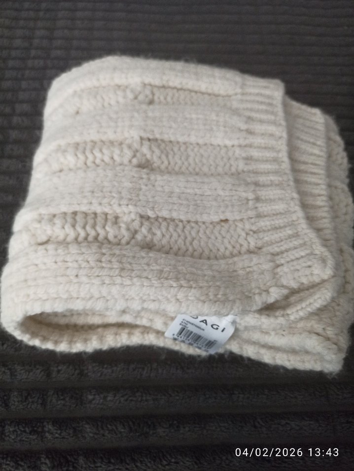 Kadınlar için yumuşak yünden örülmüş, beyaz ve gri tonlarda örgü atkı. Sade ve bohem tarzda, sıcak tutar. sadece bir kez takıldı ölçüleri 190/22 cm kalinnyumusak bir atkidir