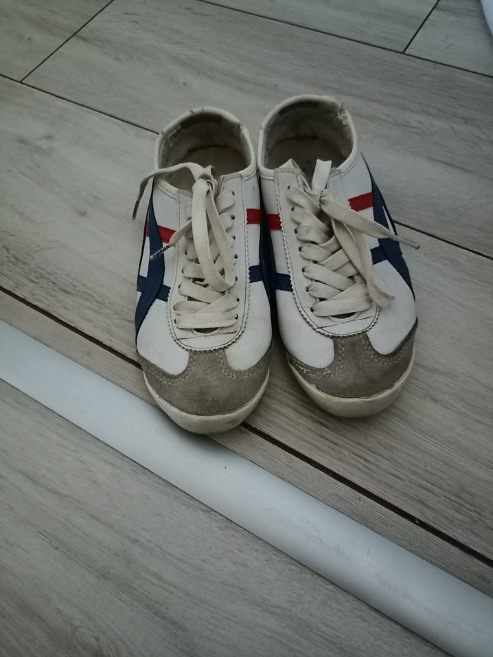 Beyaz ve gri renklerde, düz tabanlı lastik kadın spor ayakkabısı. Tokalı detaylarıyla günlük sokak stili için uygun ve rahat.