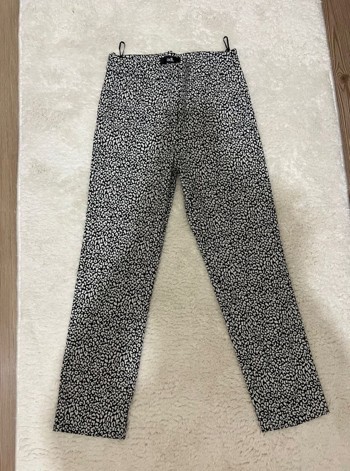 Kadınlar için beyaz ve gri zebra desenli, normal boy midi kumaş pantolon. Sentetik kumaştan, kürk detaylı, rahat kesim ve sokak modasına uygun.