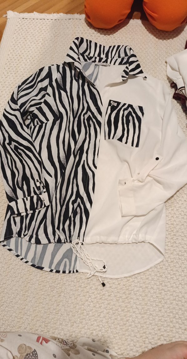 Kadın gömlek, bol kesim uzun kollu ve yakalıdır. Beyaz ve gri zebra desenleri ile kürk detayları birleşir. Midi boy ve sentetik kumaş günlük kullanıma uygundur.