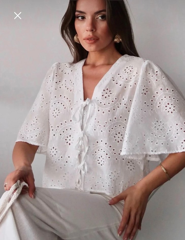 Kadın Beyaz Güpürlü Brode Bağlamalı Kısa Kol Premium Fisto Bluz