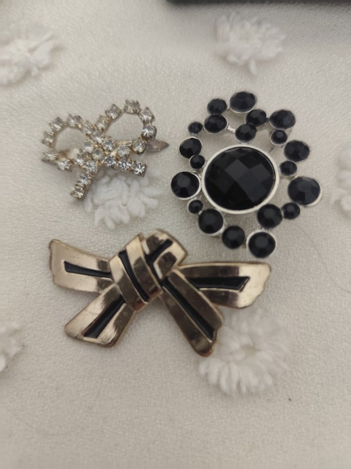 Düğünler için uygun, koyu gotik tarzda, payetli ve işlemeli üçlü kadın broş seti.