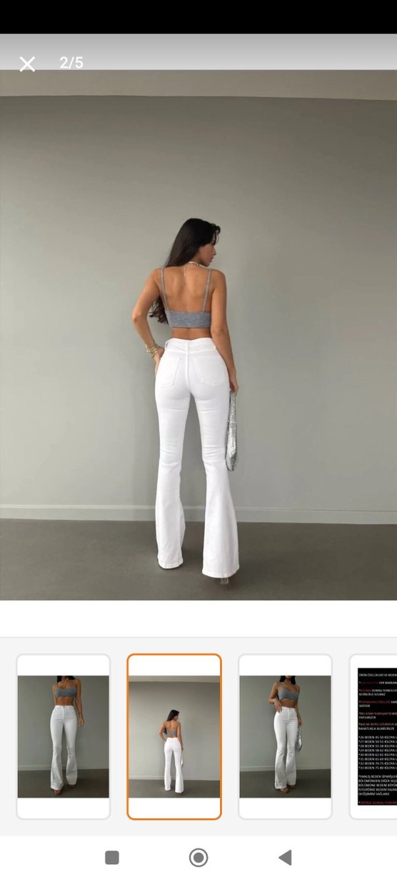 Yeni hiç kullanılmadı ama etiketi yok. 38 beden İspanyol paça beyaz kot pantolon. Boyu : 110 cm hiçbir sorunu yok tertemiz,Trendyol ürünü.
