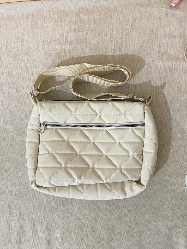 Beyaz kapitone sentetik kumaştan yapılmış, fermuarlı cep ve ayarlanabilir askıya sahip kadın omuz çantası