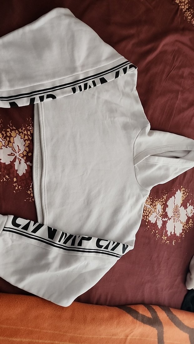 Kadınlar için beyaz, kapüşonlu crop sweatshirt beyaz kollari yazili ikikoltukarasi66cm boy 37cmdir