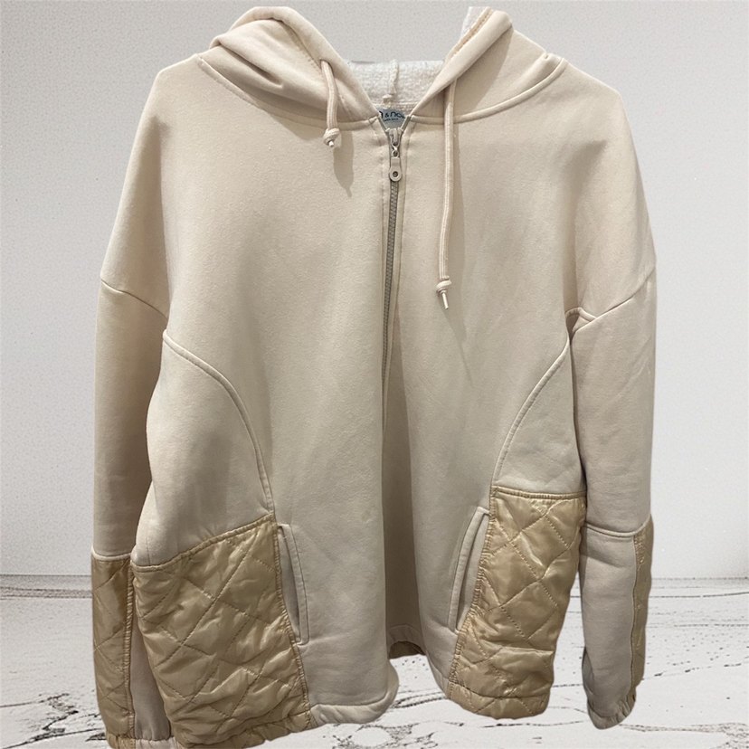 Kadınlar için kapüşonlu, fermuarlı ve uzun kollu sweatshirt. Bol kesim ve kısa boyda, kapitoneli cep detaylarına sahip. Yumuşak ve sıcak kumaştan, rahat sokak stili için.