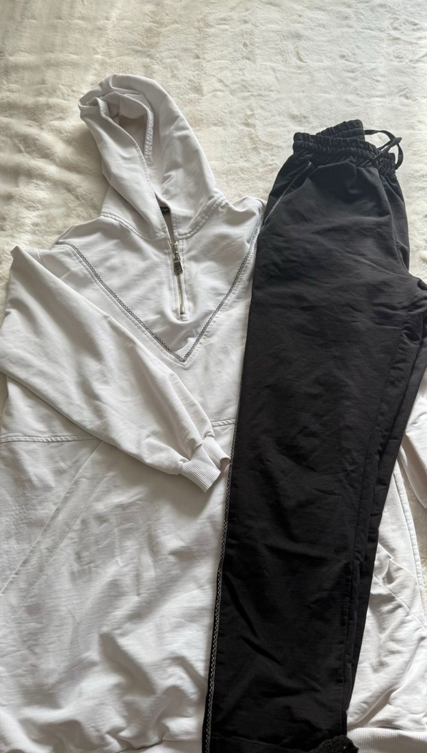 Kadın Beyaz Kapüşonlu Fermuarlı Sweatshirt ve Siyah Pantolon