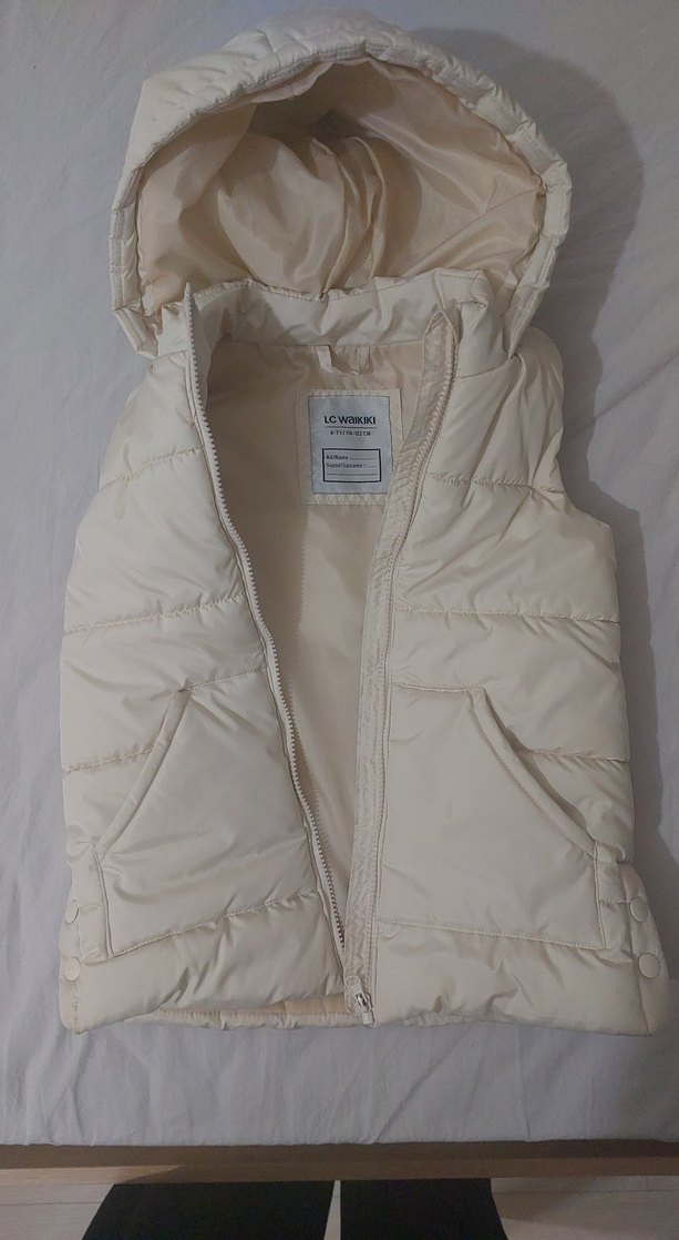 Kadınlar için pastel beyaz renkte, fermuarlı ve kapüşonlu, yumuşak ve sıcak kumaştan yapılmış, normal uzunlukta ve dar kesim yelek. Dış mekan kullanımı için uygundur.