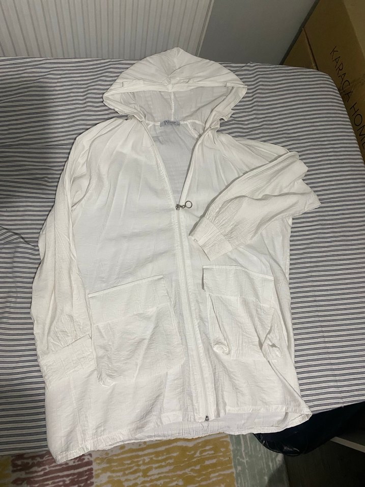 Kadınlar için beyaz kapüşonlu midi ceket, uzun kollu ve nefes alabilen keten kumaştan. Fermuarlı ön ve cepleriyle rahat ve bol kesim, günlük sokak stili için uygun. Oversize