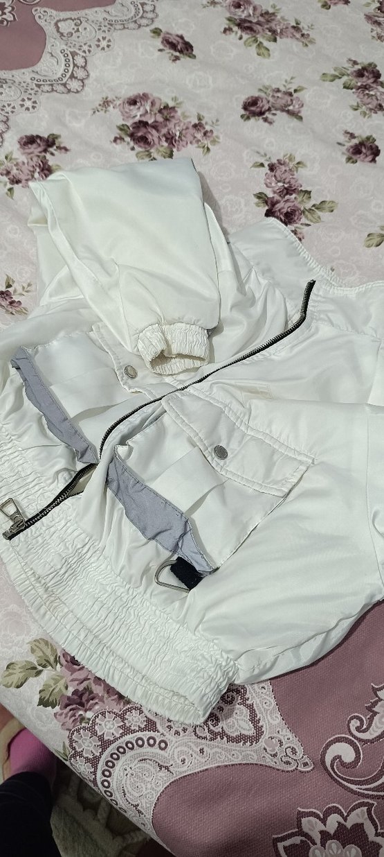 Kadın beyaz kapüşonlu, fermuarlı, bol kesim mini ceket. Gri detaylı, sentetik kumaştan, sokak stiline uygun rahat bir model. yağmurluk