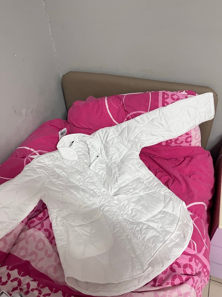 beyaz, kapüşonlu ve düğmeli mont. Uzun kollu, yumuşak sentetik kumaştan, günlük kullanıma uygun sade ve rahat bir model.hiç kullanılmadı