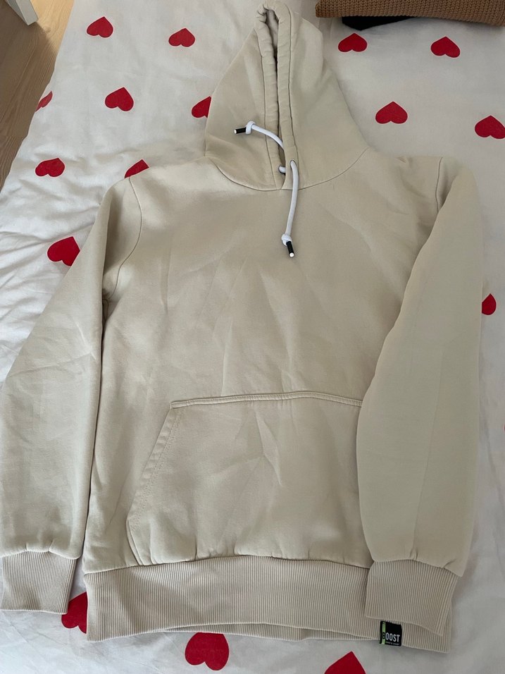 Yumuşak ve sıcak kumaştan, kapüşonlu, uzun kollu, beyaz salaş kesim sweatshirt, rahat günlük kullanım için ön cep içerir.