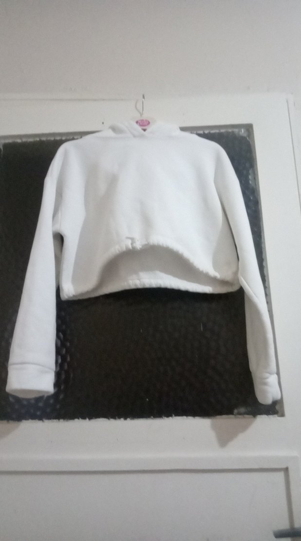 Kadın uzun kollu, bisiklet yaka, yumuşak ve sıcak kumaştan yapılmış beyaz kapüşonlu sweatshirt. Salaş kesim ve normal boyda, gündelik sokak modası için uygun.
