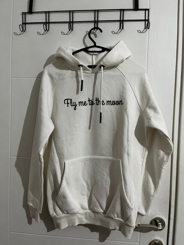 Kadın beyaz kapüşonlu sweatshirt, uzun kollu ve bol kesimdir. "Fly me to the moon" baskılıdır ve ön cep içerir. Yumuşak ve sıcak kumaştan üretilmiştir.