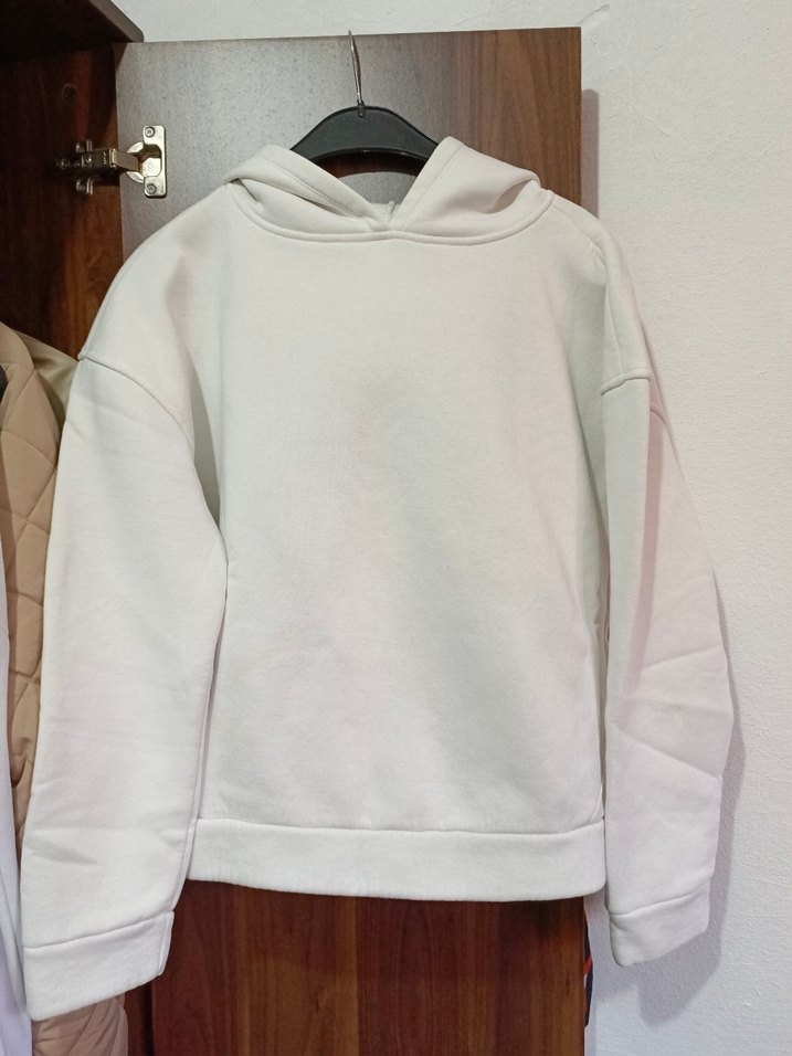 Kadınlar için beyaz, kapüşonlu, uzun kollu sweatshirt. Yumuşak ve sıcak kumaştan, salaş kesim ve normal boyda, günlük rahat kullanım için uygun. Desensiz ve sade tasarım, zahmetsiz şıklık sunar.