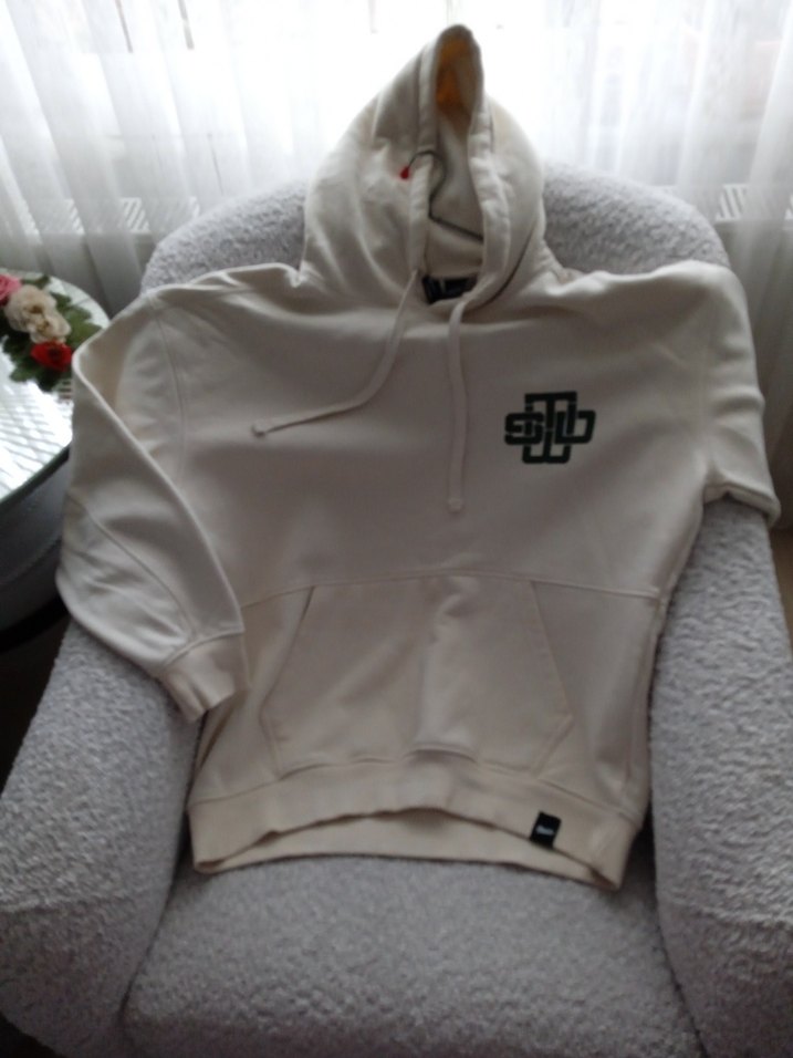 Beyaz kapüşonlu, uzun kollu, bol kesim sweatshirt. Yumuşak ve sıcak kumaş üzerinde baskılı desen bulunur. Günlük kullanım için uygundur.