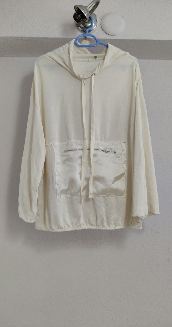 Kadınlar için uzun kollu, kapüşonlu ve bol kesimli, yumuşak keten kumaştan yapılmış beyaz sweatshirt. Fermuarlı ön cepler bulunur, minimalist sokak stili için uygundur.