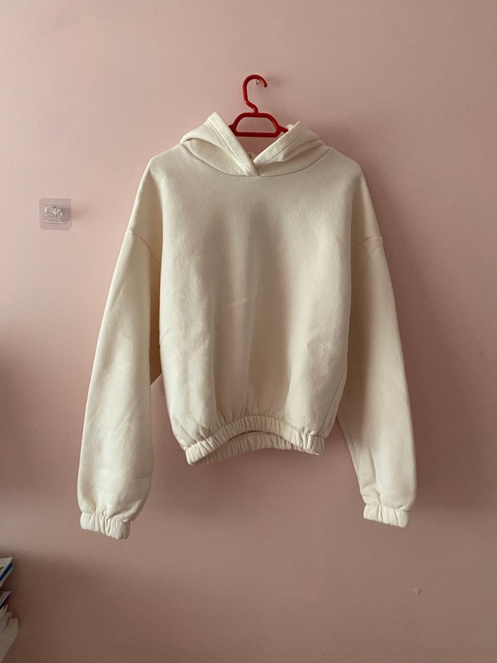 Kadınlar için beyaz kapüşonlu sweatshirt, yuvarlak yaka ve uzun kolludur. Yumuşak ve sıcak kumaştan üretilmiş, rahat ve bol kesimdir. Sokak tarzı ve sade tasarımıyla günlük kullanıma uygundur. Manşet ve etek kısmında lastik detay bulunur.