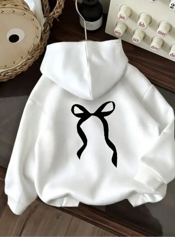 S beden ile 5xl beden aralığı mevcuttur. Ürün iki ipliktir . Beyaz kapüşonlu sweatshirt, sırtında siyah fiyonk baskısı ve bol kesim. İnce askılı kollu, yumuşak ve rahat kumaşla günlük sokak stili için uygun.