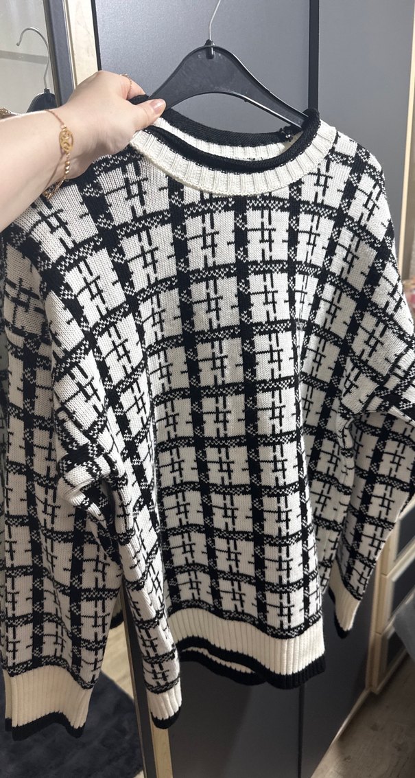 Kadınlar için beyaz ve gri kareli desenli, triko dokulu, yuvarlak yaka ve uzun kollu salaş kesim kazak. Günlük rahat kullanım için uygundur.