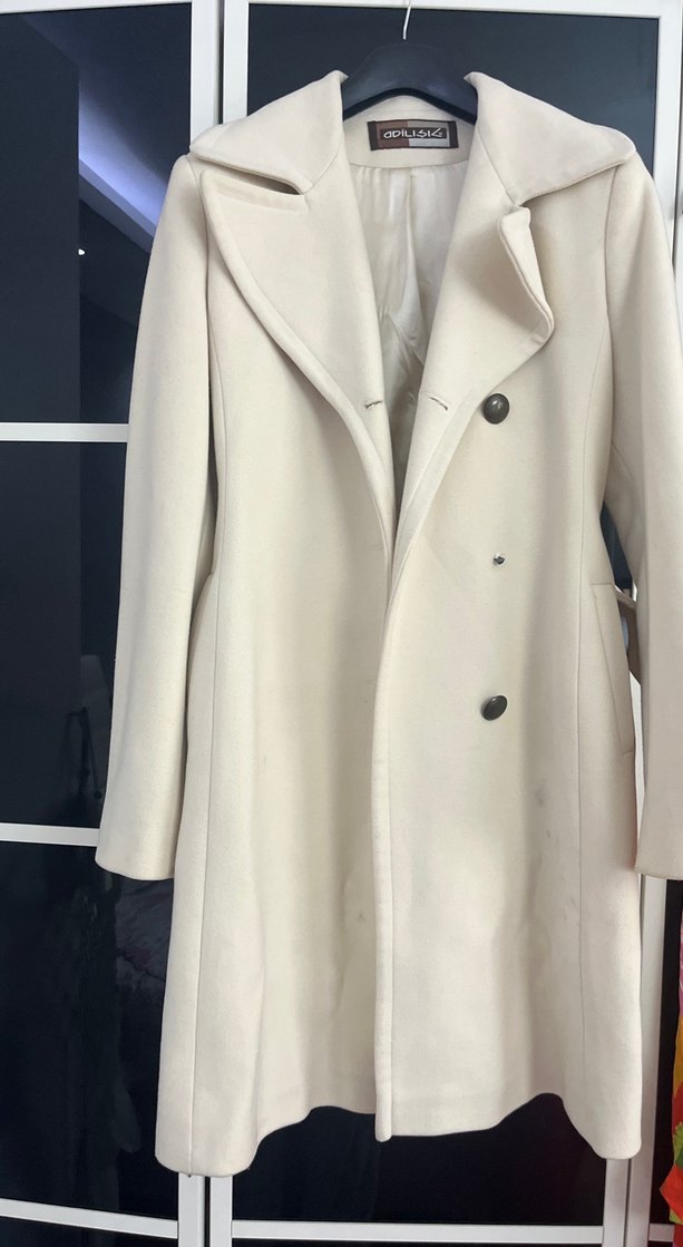 Kadın beyaz uzun kaban, düğmeli ve kesik yakalıdır. Yumuşak ve sıcak kumaştan üretilmiş, klasik ve ofis stiline uygundur. ️Kuru temizlemeye ihtiyacı var ve bir düğmesi eksik